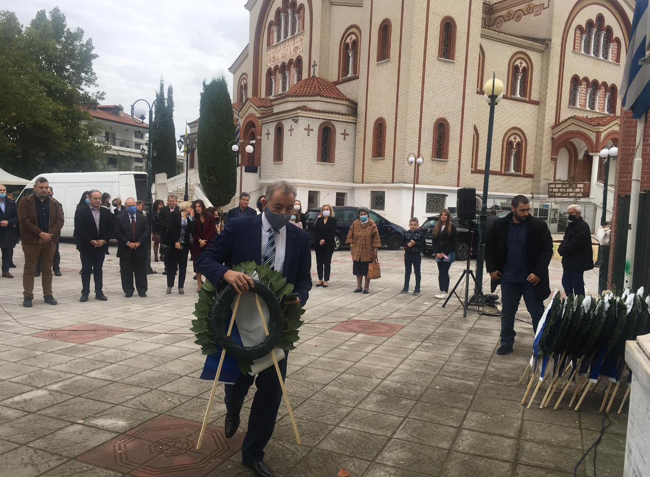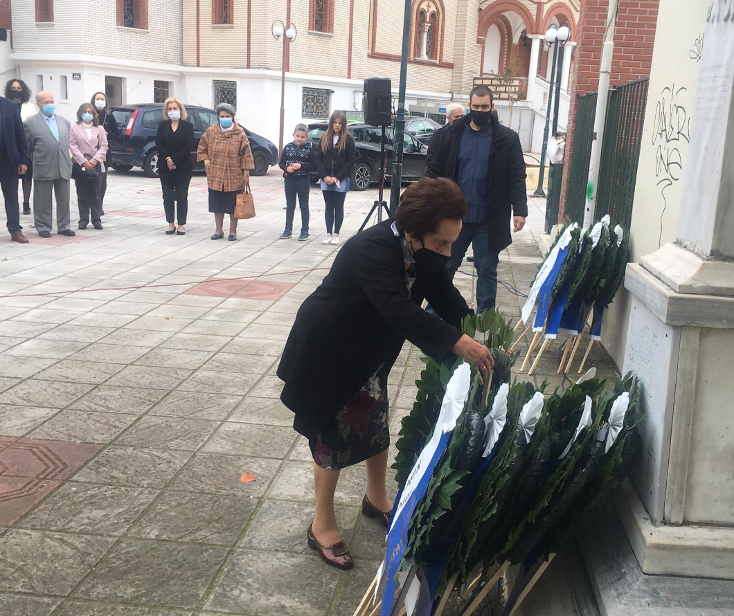 Ακολούθησε κατάθεση στεφάνων στο μνημείο Ηρώων το οποίο βρίσκεται στο προαύλιο του ναού. Τη σχετική πρόσκληση για τις σημερινές εκδηλώσεις μνήμης απηύθηναν ο δήμαρχος Θέρμης Θεόδωρος Παπαδόπουλος, ο πρόεδρος της κοινότητας Θέρμης Τριαδίου Στάθης Πιστέλας και ο πρόεδρος του Συλλόγου Γηγενών Μακεδόνων Θέρμης «Ο Μέγας Αλέξανδρος» Ανέστης Κεφαλάς.